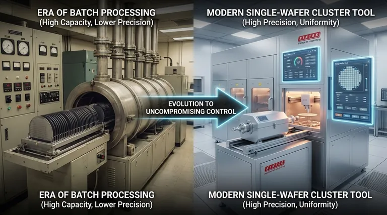 كان التطور من الترسيب الكيميائي للبخار المعزز بالبلازما (PECVD) الدفعي إلى أحادي الرقاقة مدفوعًا بمتطلب واحد غير قابل للتفاوض: الحاجة إلى التحكم المطلق في العملية. مع أصبحت أجهزة أشباه الموصلات أصغر وأكثر تعقيدًا، تخلت الصناعة عن الإنتاجية الخام للأنظمة الدفعية مقابل التجانس والدقة التي لا هوادة فيها للمعالجة أحادية الرقاقة.
