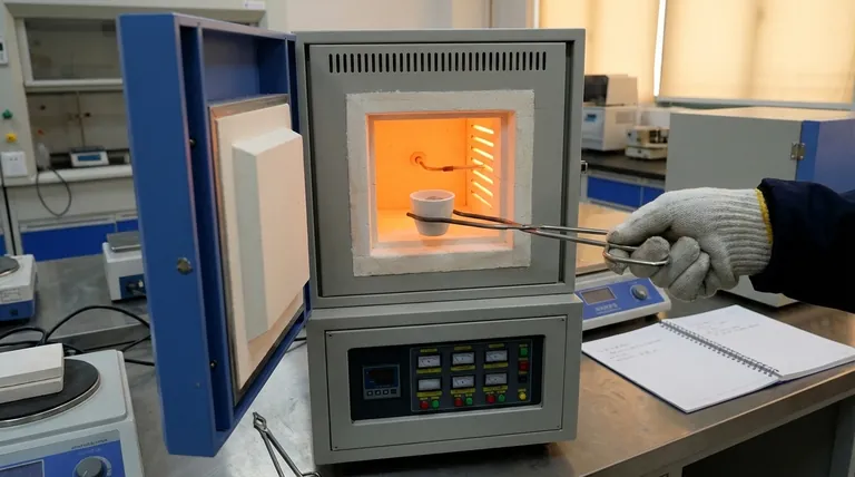 بمجرد أن يبرد الفرن إلى درجة حرارة آمنة، يمكنك فتح الباب بالكامل. استخدم كماشة البوتقة لإزالة الوعاء الساخن بعناية. لمنع الحروق وحماية العينة من رطوبة الغلاف الجوي أثناء برودتها، انقل البوتقة الساخنة فورًا إلى مجفف (desiccator).