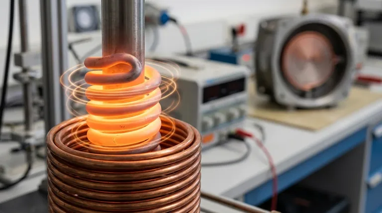 - الملف والتيار المتردد (AC): يستخدم سخان الحث ملفًا (محثًا) يتم تزويده بالتيار المتردد عالي التردد (مثل 182 كيلو هرتز في المثال). يخلق التيار المتردد مجالًا مغناطيسيًا متذبذبًا بسرعة حول الملف.